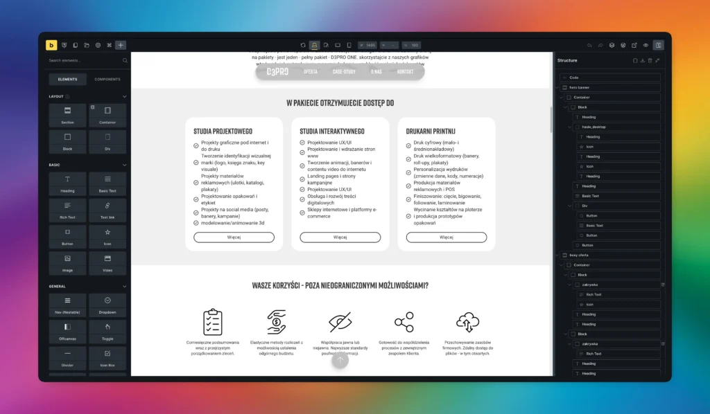Klienci otrzymują od nas stronę wyposażoną w wizualny edytor Bricks, pozwalający łatwo wprowadzać zmiany. Bricks jest nowoczesnym, szybkim i dobrze napisanym edytorem wizualnym. Dla Klientów może być prostym narzędziem wprowadzania zmian, dla nas jest potężnym środowiskiem produkcyjnym.
